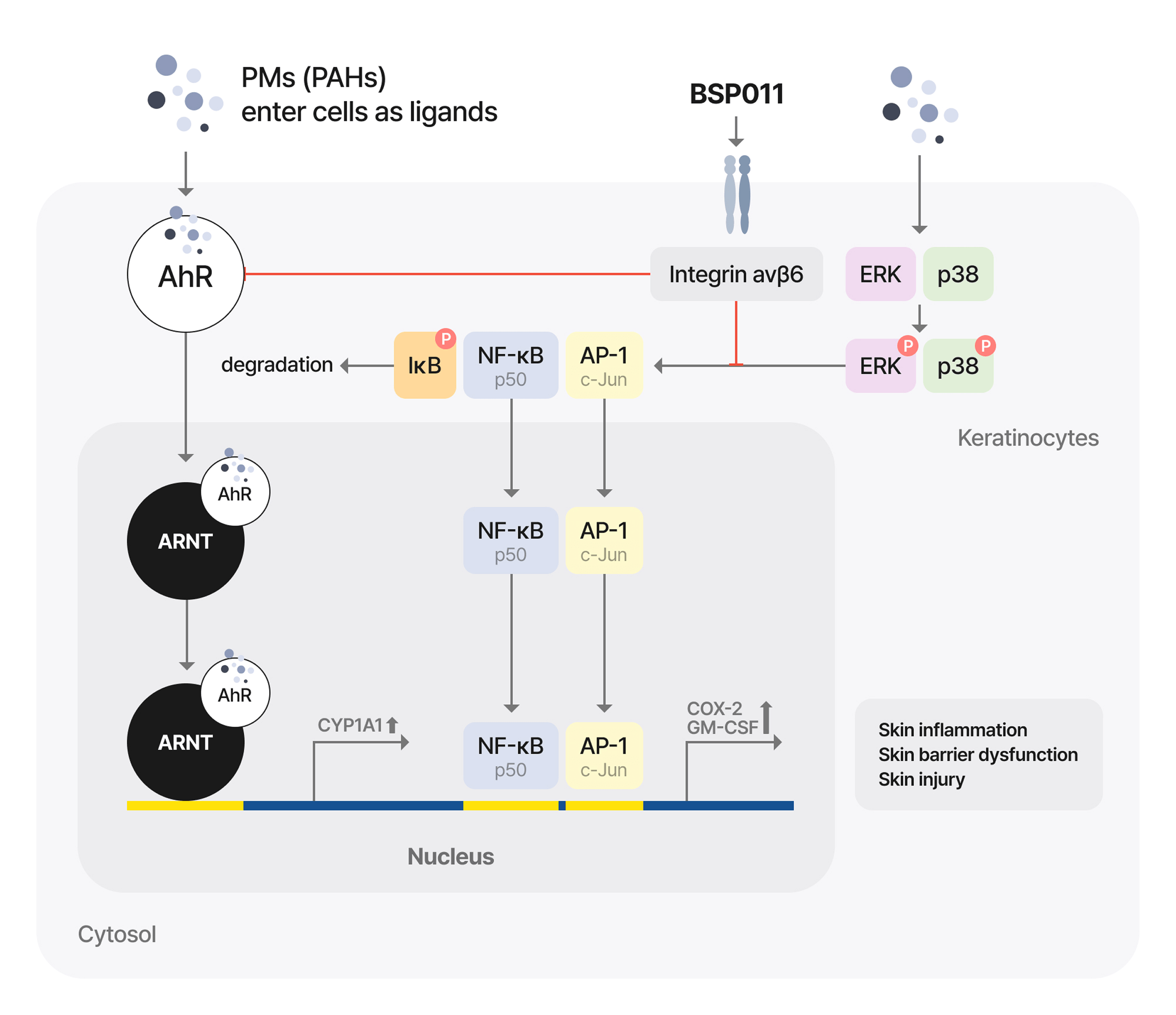 PM10 등 외부 환경 자극은 피부에서 AhR/ARNT 신호를 활성화하고 MAPKs, NF-κB, AP-1 경로를 통해 COX-2, GM-CSF, CYP1A1 등