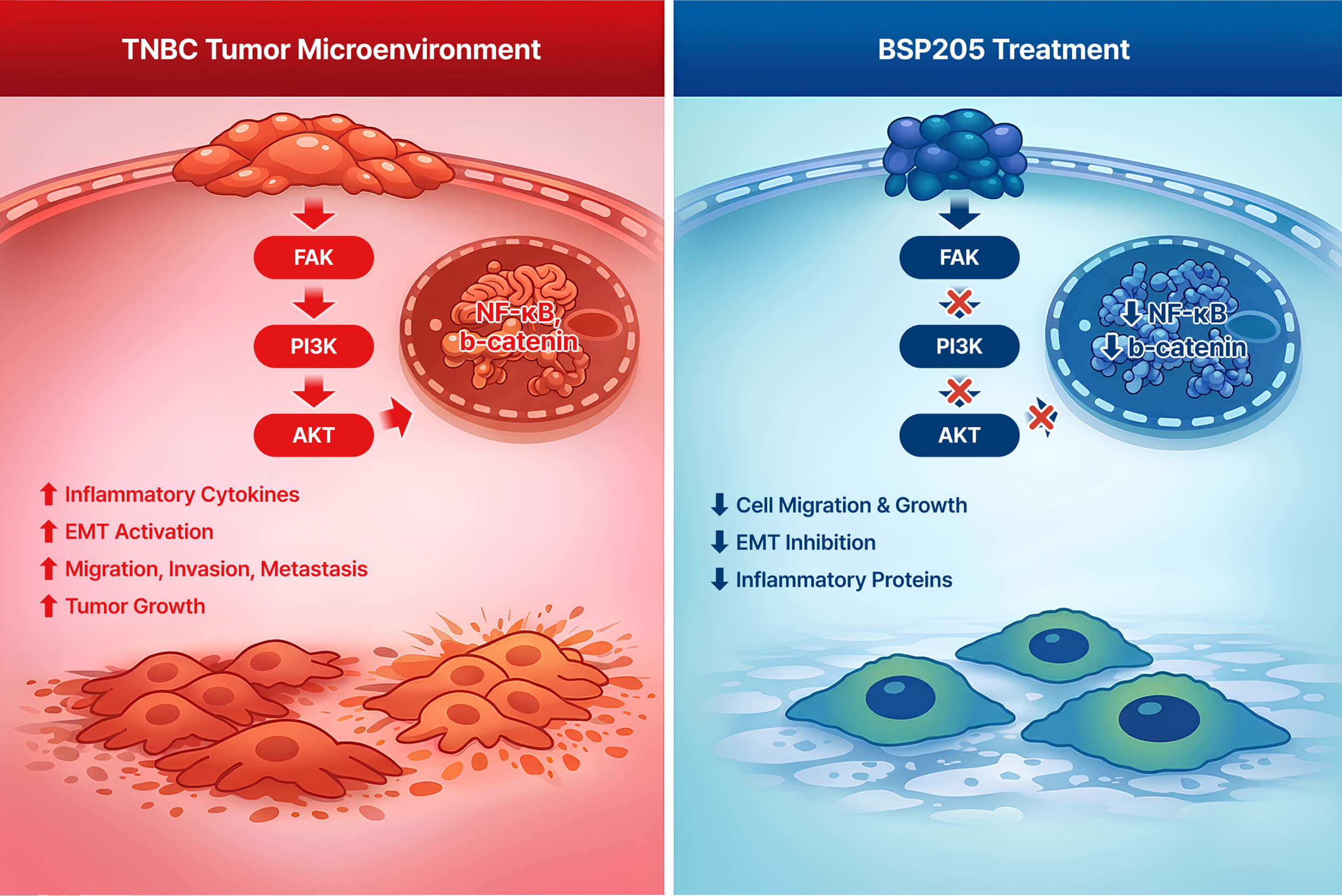 BSP205는 FAK-PI3K-AKT 경로 조절을 통해 종양 촉진 미세환경 형성 완화를 목표로 합니다.